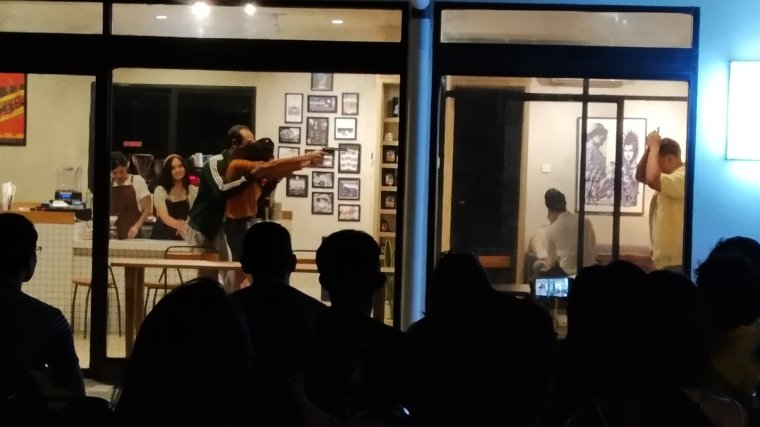 Sejak awal, dengan tergantungnya poster film Reservoir Dogs di dinding di dalam kafe tempat drama penyanderaan berlangsung, lalu para aktor masuk ke panggung, kita ‘hendak’ dibawa ke dunia film kriminal/gangster Hollywood. Rasa Tarantino atau Francis Coppola hadir sekali di pementasan ini. Dialog – dialog comotan drama barat, karakter -karakter serasa film Scarface, tetapi dalam sebuah konsep permainan ruang yang durhaka terhadap konteks: karena di pementasan ini, langit (baca: barat) dijinjing, bumi tidak mau dipijak. Dan kalau bumi tidak mau dipijak, bumi akan melawan.