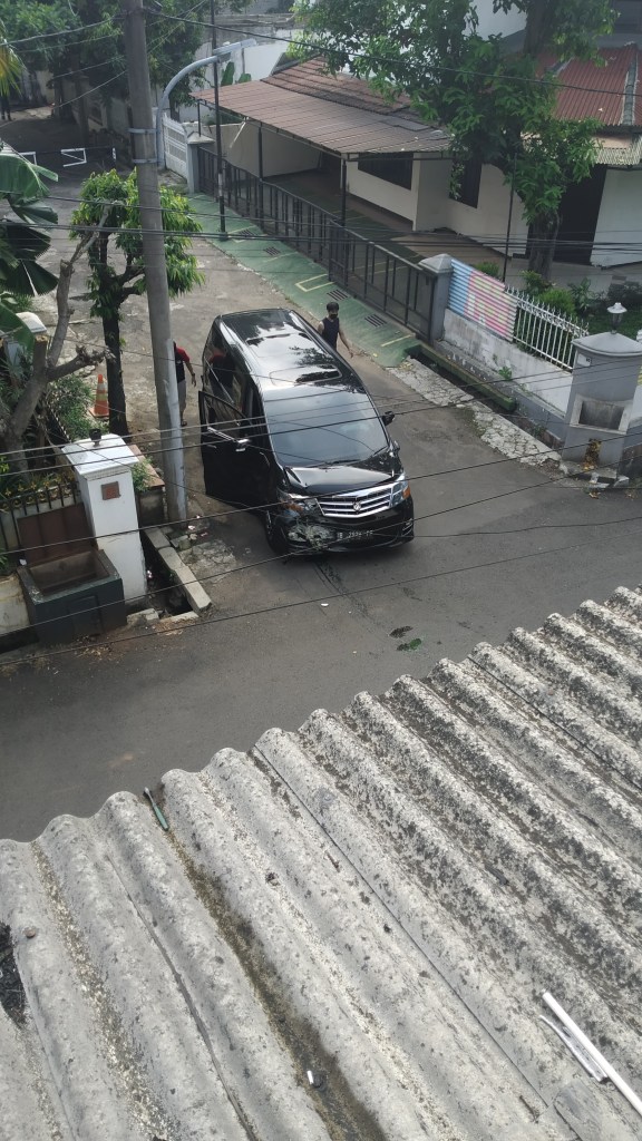 Pagi ini ada insiden: sebuah mobil Alphard yang kinclong dan baru menabrak tembok kosan saya dengan sangat parah, kecepatan tinggi, hingga bagian depanya hancur, cairan warna hijau keluar dari mobil, dan asap keluar dari mesin. Kejadian ini berlangsung dengan sangat konyol.